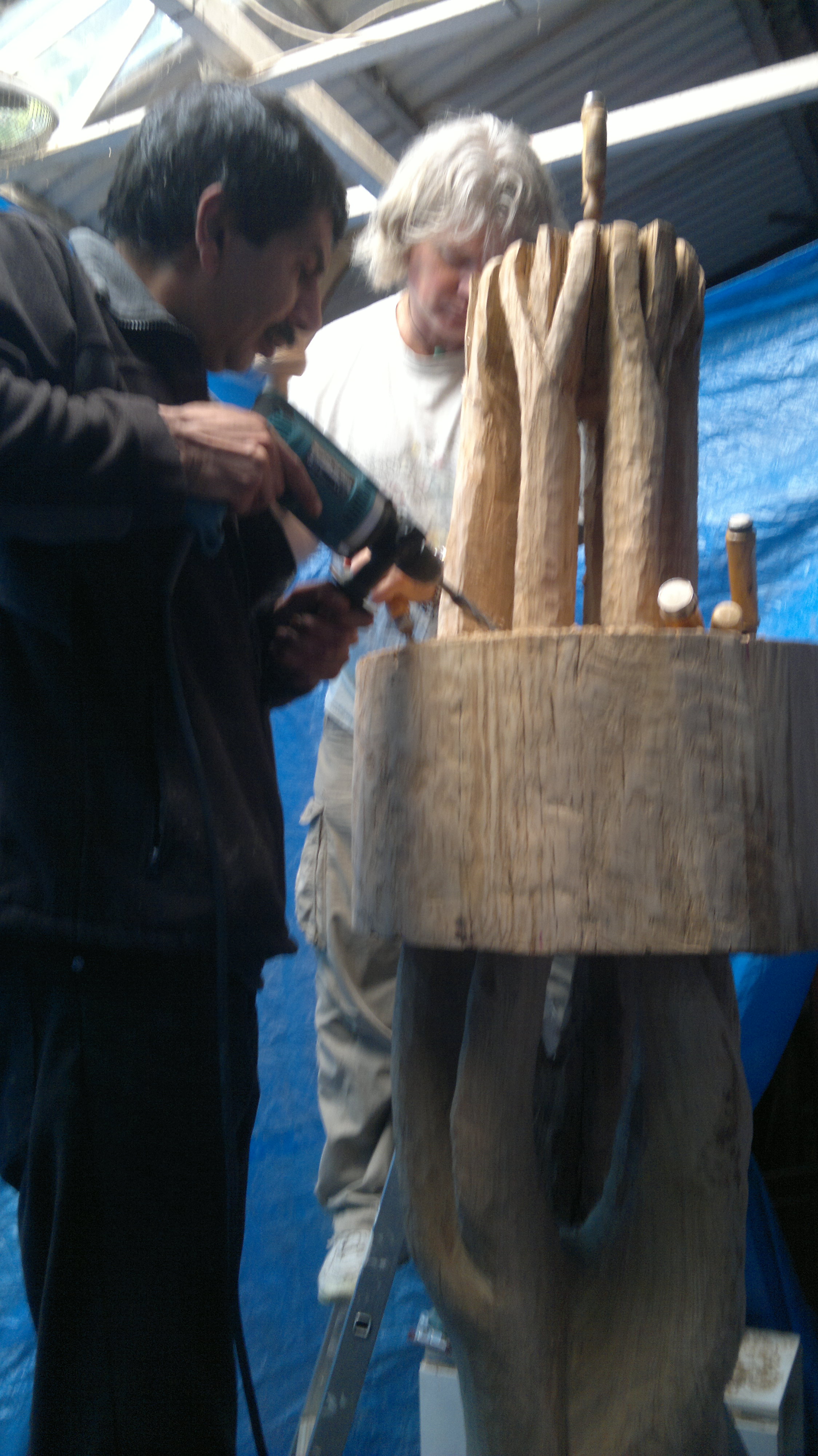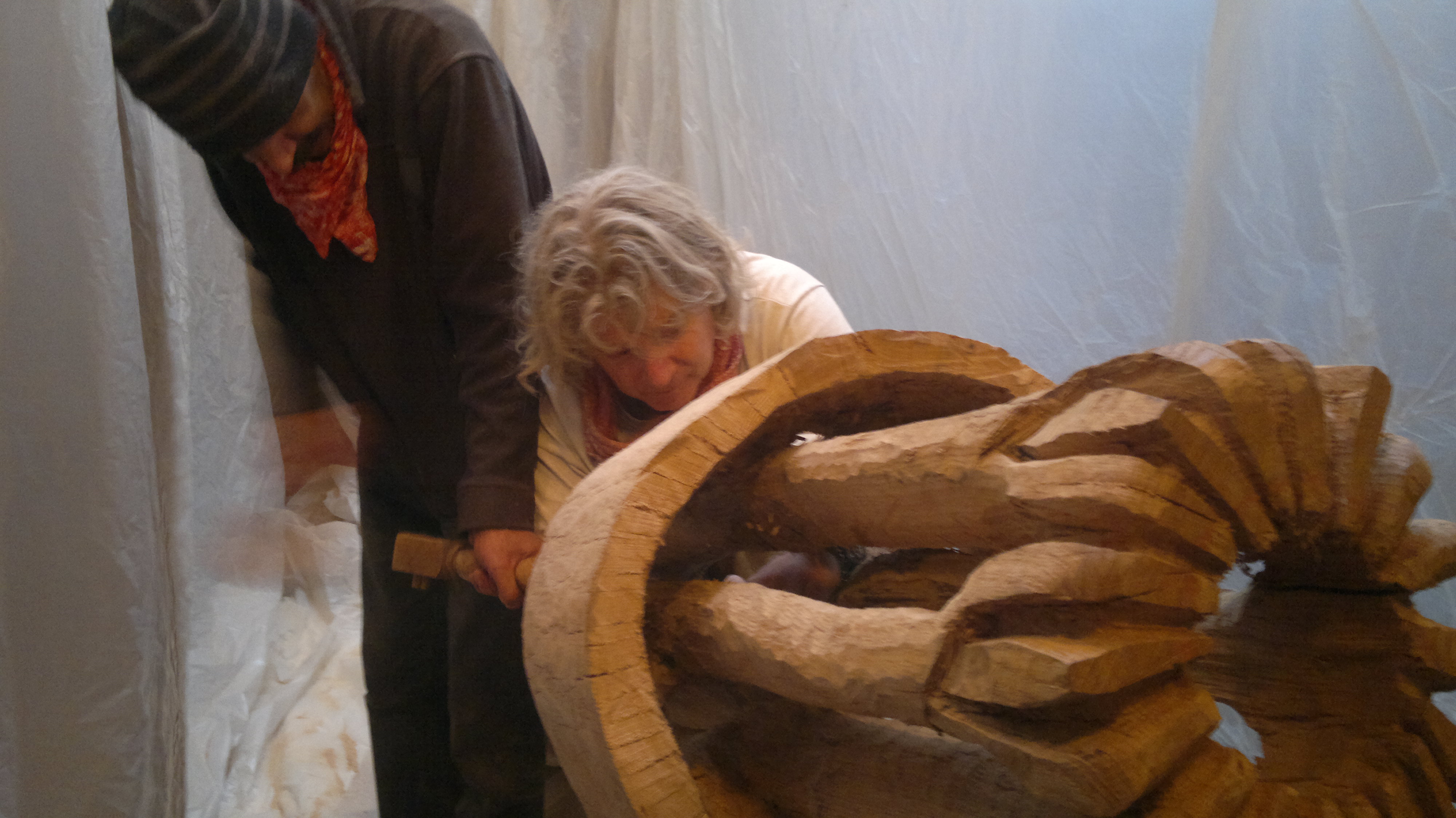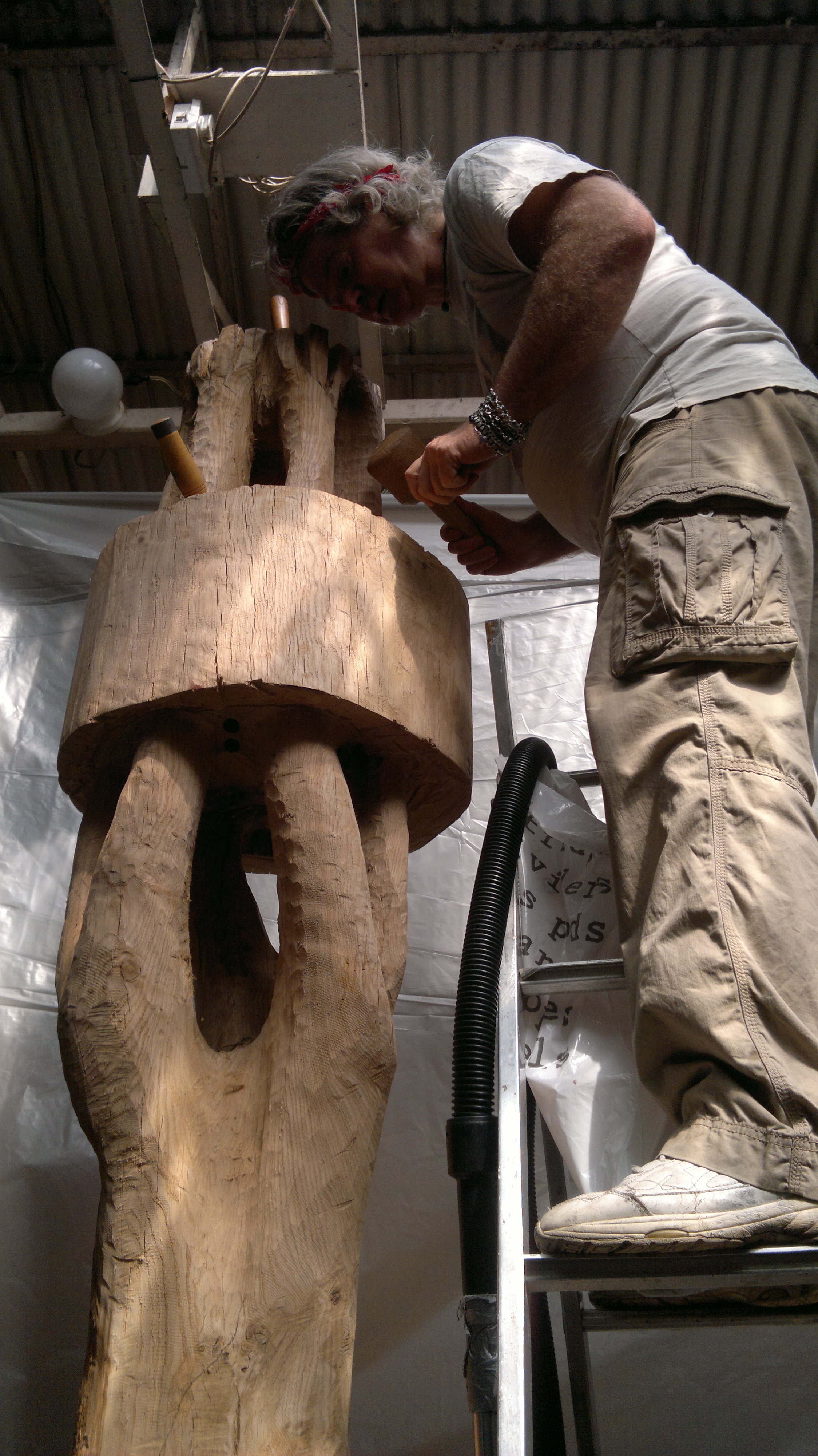 having roughed out the form of the standing tree, the band remains as a solid heavy cross-section of the original log. waiting to be pierced through until it is a hollow ring floating around the uprights. this requires an Expedition into the Interior. balanced up on ladders and table tops, undergoing acrobatic contortions, we use a powerful drill with an auger bit to pierce through the foot of oak with as many holes as possible… then bash out the bits in between with mallet and gouge – good clean violent fun.
